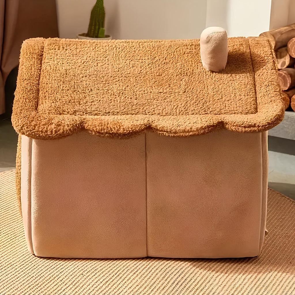 Shaped like a cozy little house with a plush roof, chimney, and a friendly bear face, it offers your pet a private, inviting space to sleep, relax, and feel completely safe.