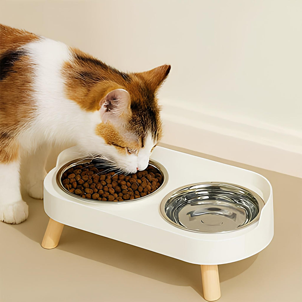 The raised stand brings food and water to an optimal height, preventing your cat from bending too low and helping older or arthritic cats eat more comfortably. The two removable bowls allow you to serve food and water side by side, keeping mealtime organized and mess-free.